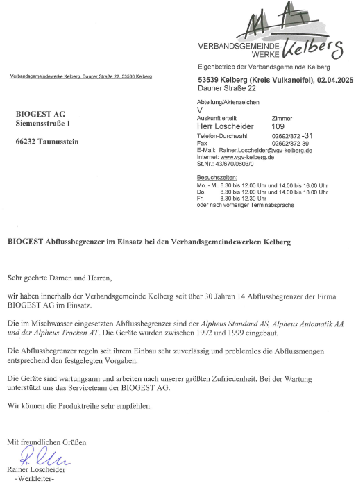 Ein herausragendes Beispiel für die Zuverlässigkeit unserer Produkte ist das Referenzschreiben von Rainer Loscheider von den Verbandsgemeindewerke Kehlberg.