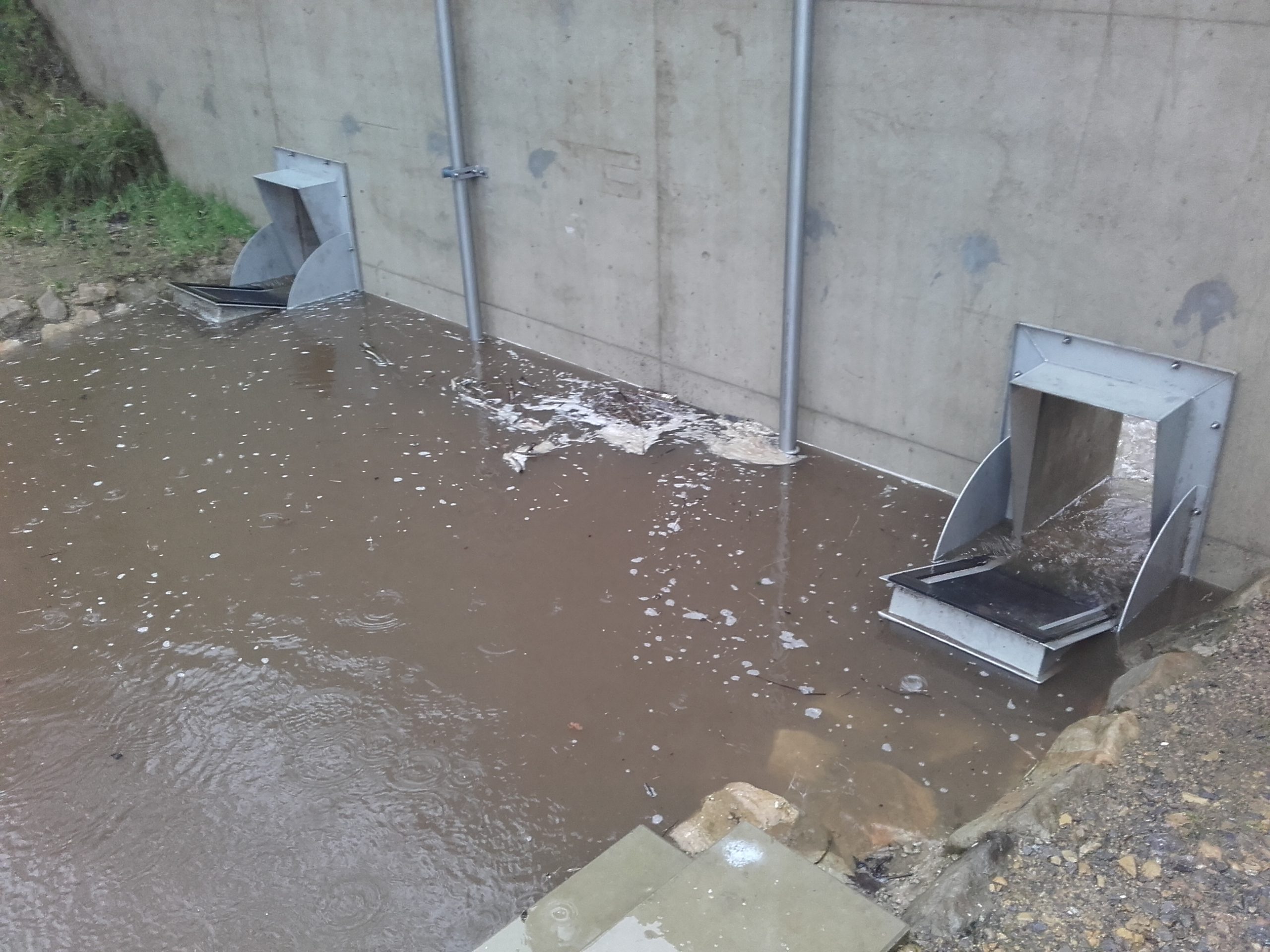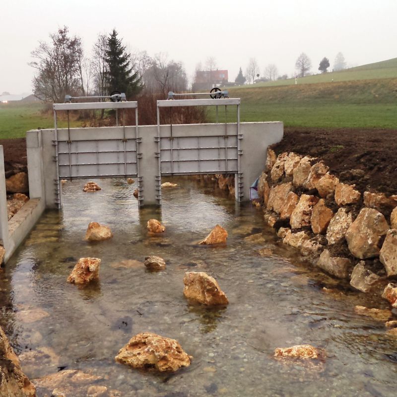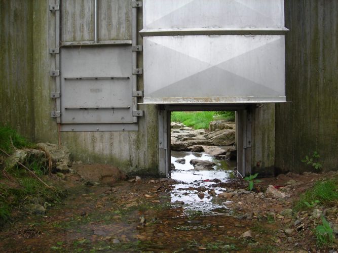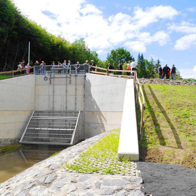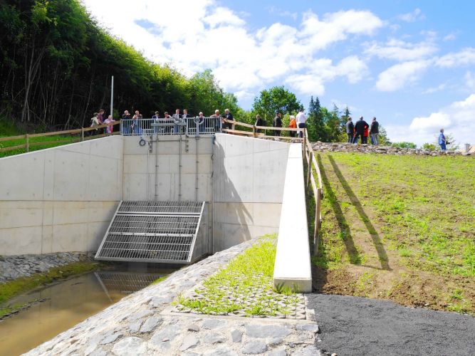 Bei sinkendem Wasserspiegel öffnet sich die Kleintierklappe wieder und ermöglicht letztendlich wieder die terrestrische oder auch ökologische Durchgängigkeit der Hochwasserrückhalteanlage.