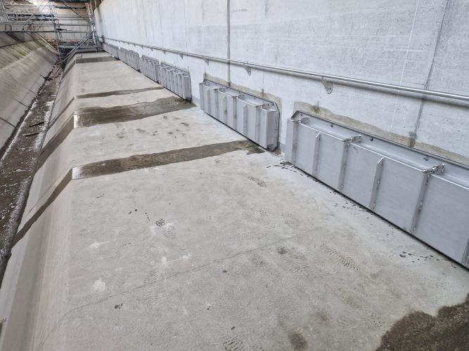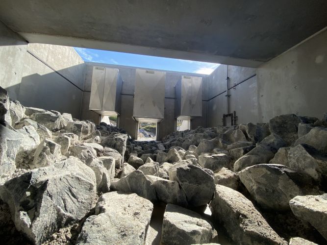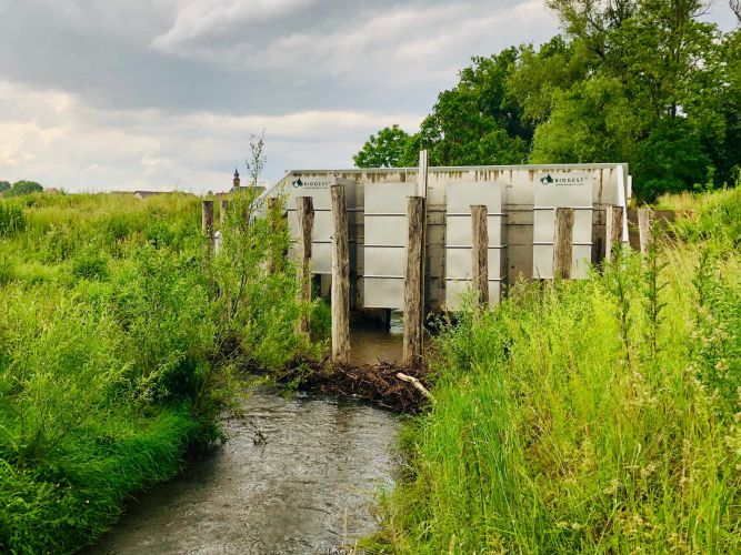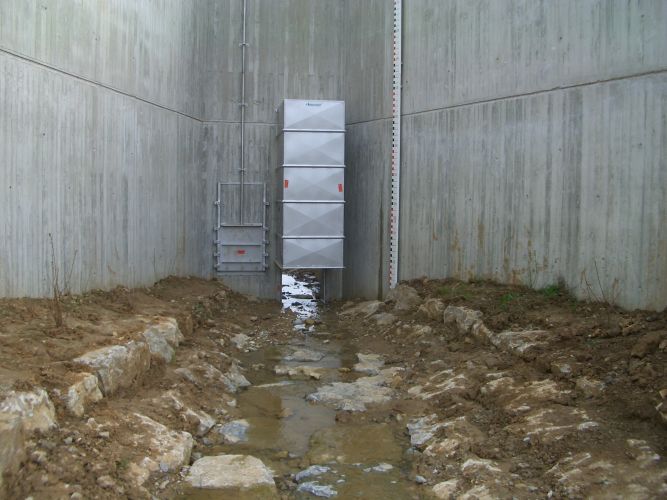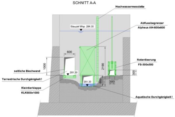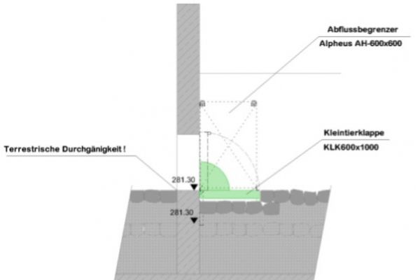 Die BIOGEST®-Kleintierklappe Typ KTK® ist im Niedrigwasser-Fall komplett geöffnet, schließt mit der seitlichen Bermenoberkante höhengleich ab und stellt so die Passierbarkeit für Fluginsekten und andere Tiere sicher. Zur Gewährleitung der Durchgängigkeit (aquatisch, amphibisch, terrestrisch) ist im Niedrigwasser-Fall ebenfalls die rechteckige Schieber-Öffnung des BIOGEST-ALPHEUS-Abflussbegrenzer Typ AH komplett geöffnet. Auch die Lichtdurchlässigkeit sowie ein „gewünschtes Durchfliegen“ des Durchlasses im HRB vom Eisvogel“ wird dabei gewährleistet.