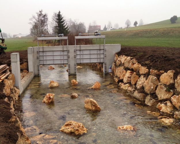 Bei sinkendem Wasserspiegel öffnet sich die Kleintierklappe wieder und ermöglicht letztendlich wieder die terrestrische oder auch ökologische Durchgängigkeit der Hochwasserrückhalteanlage.