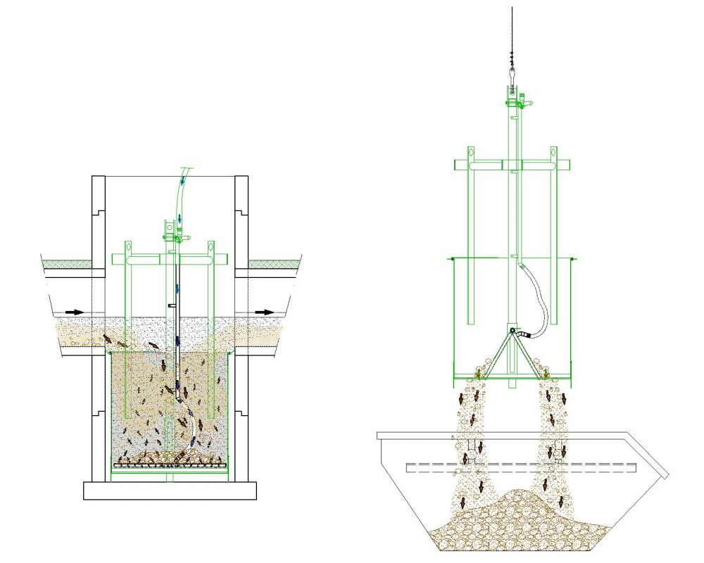 Zum Entleeren wird der Geschiebesammeleinsatz, nach Abkopplung der Druckluftleitung mittels Kranösen, komplett aus dem Geröllfangschacht herausgehoben. Das Geschiebe bleibt vollständig im Sammeleinsatz.