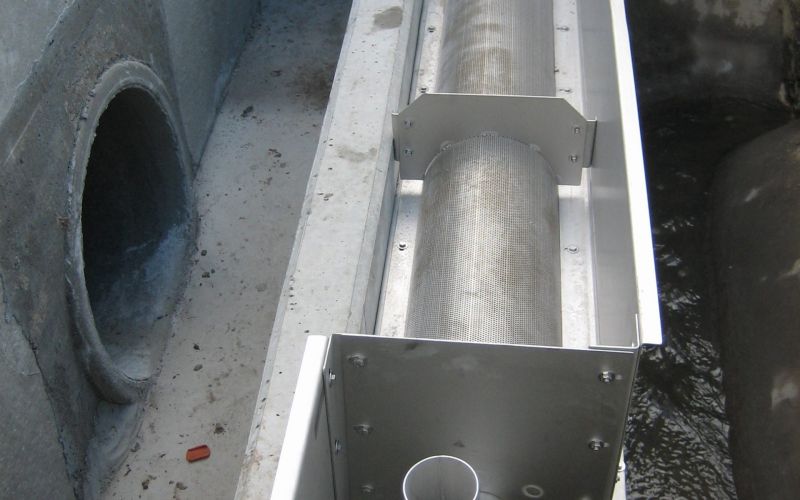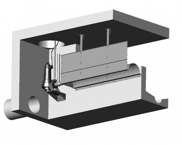 Die unerwünschten Schwimm- und Schweb-stoffe werden im Sieb entsprechend der Lochung des Siebkorbes (6 mm Lochung) zurückgehalten. Die Abreinigung der Siebfläche erfolgt mittels einer Tauchmotorpumpe mit Spezialdüse. Diese sorgt für einen geführten Siebgutabtransport in Fließrichtung, bis dieser ausgetragen wird. So wird die Siebkorbfläche permanent freigehalten und das Siebwasser kann Richtung Vorfluter oder Becken abgeschlagen werden.