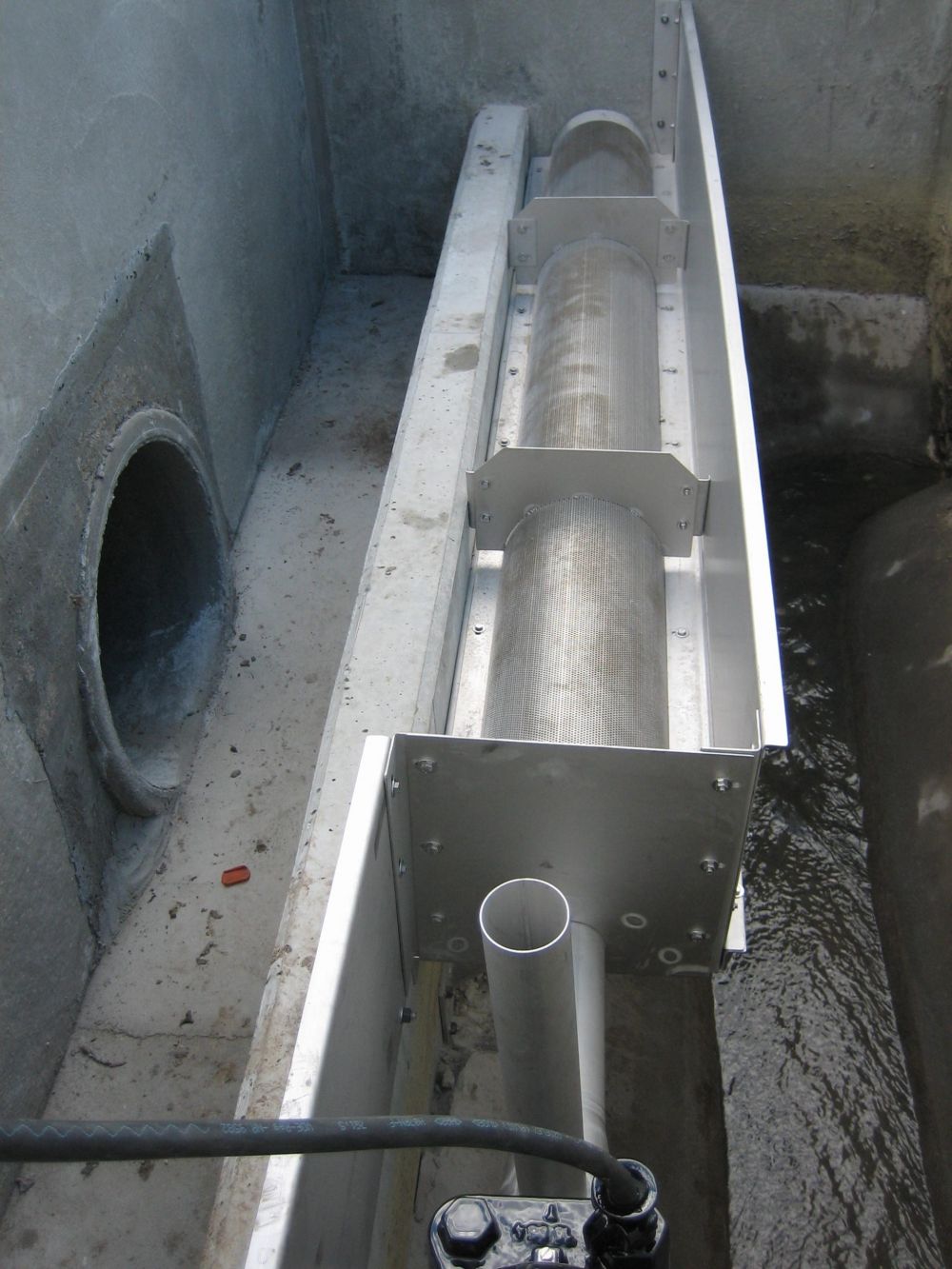 Die unerwünschten Schwimm- und Schweb-stoffe werden im Sieb entsprechend der Lochung des Siebkorbes (6 mm Lochung) zurückgehalten. Die Abreinigung der Siebfläche erfolgt mittels einer Tauchmotorpumpe mit Spezialdüse. Diese sorgt für einen geführten Siebgutabtransport in Fließrichtung, bis dieser ausgetragen wird. So wird die Siebkorbfläche permanent freigehalten und das Siebwasser kann Richtung Vorfluter oder Becken abgeschlagen werden.