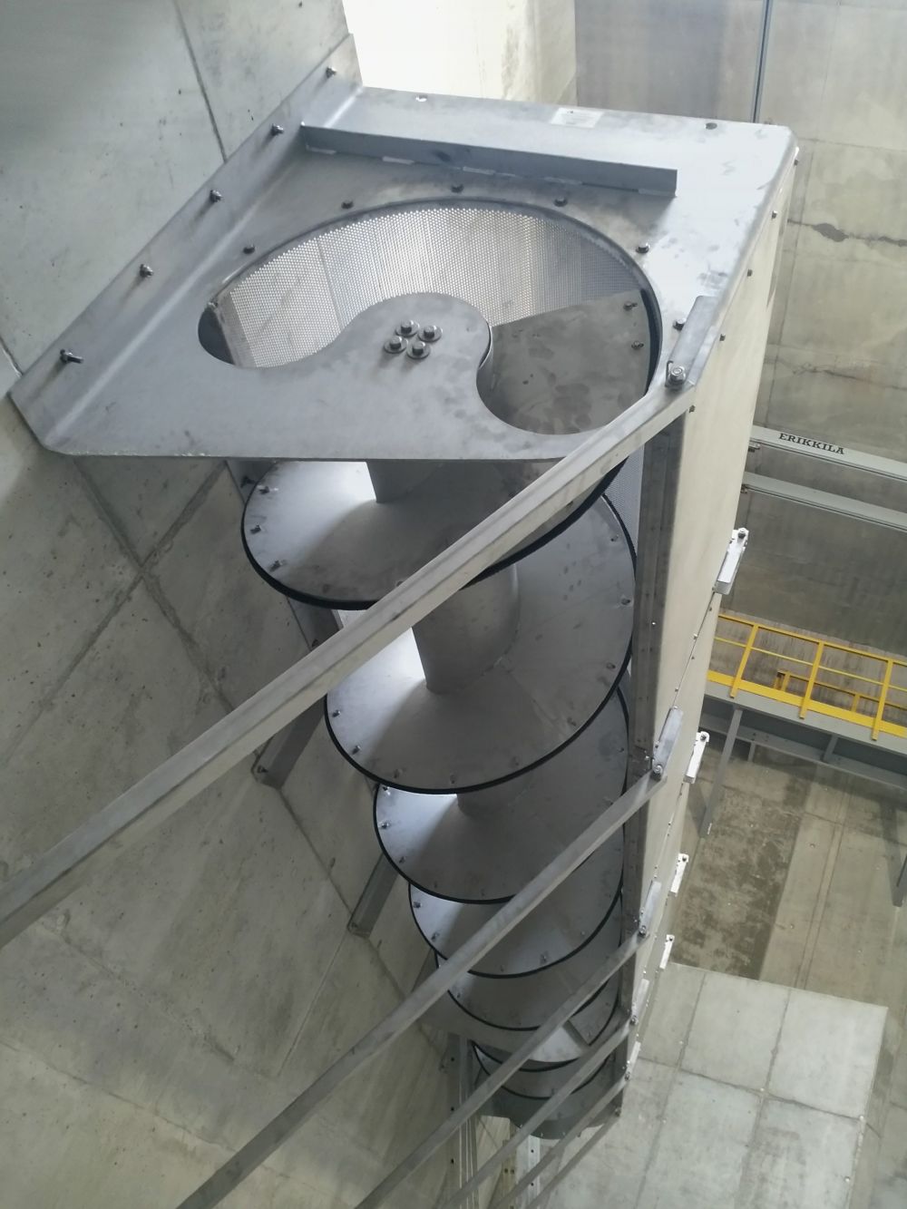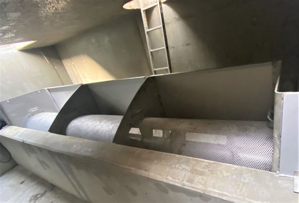 Die unerwünschten Schwimm- und Schwebstoffe werden im Sieb entsprechend der Lochung des Siebkorbes (6 mm Lochung) zurückgehalten. Die Abreinigung der Siebfläche erfolgt durch eine Spiralschnecke. Diese sorgt für einen geführten Siebgutabtransport, bis es in Fließrichtung ausgeworfen wird. So wird die Siebkorbfläche permanent freigehalten und das Siebwasser kann Richtung Vorfluter oder Becken abgeschlagen werden.